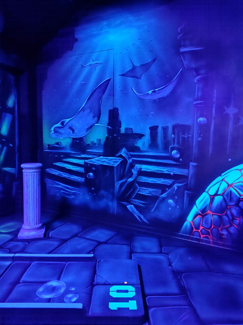 Décoration fluo sur le thème des abysses et des fonds marins - Piste de golfs immersives sous lumière fluo.